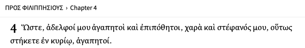 Ὥστε, ἀδελφοί μου ἀγαπητοὶ καὶ ἐπιπόθητοι, χαρὰ καὶ στέφανός μου, οὕτως στήκετε ἐν κυρίῳ, ἀγαπητοί.